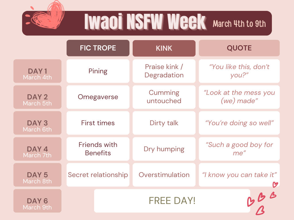 This is a fan-made event; you can participate however you want to! Art, fics, threads, fanvids, comics, doodles, headcanons… everything is welcome!Remember that sharing, liking and commenting is also a way of participating and a vital part of fandom. Give feedback, thank the artists/writers… in two words — spread love!Important! When sharing your work, tag us (@iwaoinsfw) and use the event's hashtag (#iwaoinsfwweek2026) so we can retweet itIf you're posting your work to AO3, you can add it to the Iwaoi NSFW Week's 2026 Collection.❥ What are the rules?