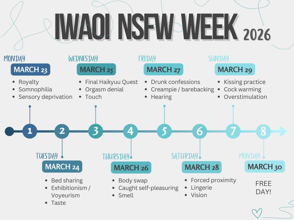 Welcome to a new NSFW Iwaoi Week!This is an explicit, +18 event created to celebrate in a very spicy way this amazing ship ♥The Event will run from March 23 to March 30. Here you can find the prompts chosen for the Week. Have fun creating!Please check all the useful info in the links as well as our twitter & bluesky accounts! →
